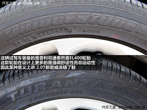 但使用了18寸的輪轂,新君威是不是就足夠運動了呢?輪胎的選擇是非常重要的因素,新君威錯誤地選擇了一款普利司通的泰然者EL400型245/45 R18 96V輪胎,非常遺憾,這款輪胎的側(cè)重點是舒適性而非運動能力,抓地力不足,在2.4旗艦版上或許還不是大的問題,但對于2.0T發(fā)動機則不能很好地發(fā)揮它的性能。