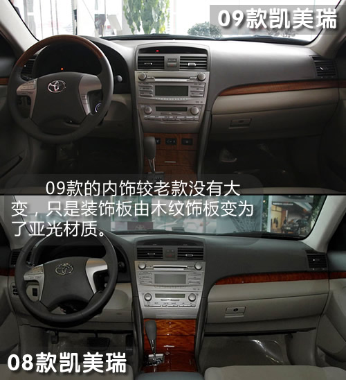 與外形只是細(xì)節(jié)小改相同,09款凱美瑞的內(nèi)飾也沒有給我們帶來太多新意。大面積的亞光飾板取代了原先的木紋裝飾,顯得更有檔次——避免再被人指責(zé)為塑料感強(qiáng)烈的尷尬。