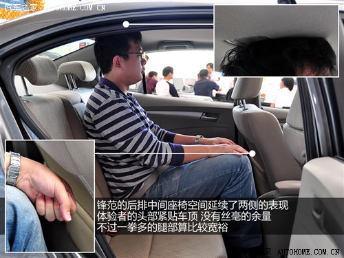 得益于較長的軸距,鋒范在內(nèi)部縱向空間上的表現(xiàn)的確出色。但由于前排座椅設(shè)計(jì)的更為厚實(shí)一些,因此體驗(yàn)者的腿部空間依然是和飛度上相同的兩拳。即便是換坐到中間座位,腿部依然有較出色的一拳多。此外鋒范的后排地板和飛度一樣屬于略有凸起但不影響舒適性的范疇。不過鋒范在內(nèi)部垂直空間的表現(xiàn)上實(shí)難令人滿意,雖然車頂有為爭取更多頭部空間而設(shè)計(jì)的內(nèi)凹造型,但實(shí)際效果不明顯?傊阡h范內(nèi),體驗(yàn)者的頭部壓抑和不適感十分明顯。