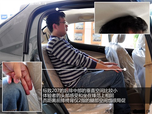 坐在標致207后排兩邊的正常座位上,體驗者頭部距離車頂僅兩指,這不太符合基本舒適性的要求,但也可以忍受。而腿部空間的表現(xiàn)可以被接受,頭枕的可調(diào)高度很符合安全性及舒適性的綜合標準。