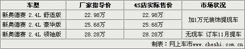 據(jù)北京地區(qū)廣州本田4S店銷(xiāo)售人員介紹,新款?yuàn)W德賽在上市之前訂單數(shù)量已經(jīng)非;鸨,上市之初各經(jīng)銷(xiāo)商只有展車(chē)和試駕車(chē)。目前訂單數(shù)量仍在增加,只有部分4S店有部分現(xiàn)車(chē)銷(xiāo)售,消費(fèi)者要提現(xiàn)車(chē)的話(huà)則必須要加裝1萬(wàn)元的裝飾。如果訂車(chē)的話(huà)需要繳納5000元-1萬(wàn)左右訂金,11月初才能提到車(chē)。