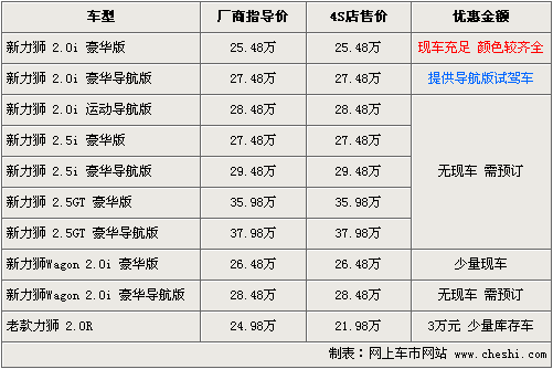 據(jù)斯巴魯北京地區(qū)4S店銷售人員介紹:新款力獅已經(jīng)到店,目前全部為2.0i豪華版及Wagon豪華版,2.0i現(xiàn)車比較充足,顏色有藍(lán)色、白色、銀色、黑色、灰色可選。另外還提供了2.0i導(dǎo)航版為試駕車,而老款力獅還有少量庫(kù)存車,現(xiàn)優(yōu)惠3萬(wàn)元。