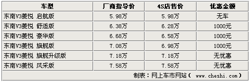 據(jù)東南經(jīng)銷商處銷售人員介紹,目前V3菱悅風(fēng)采版及升級(jí)后的旗艦版正在逐步充足貨源,最低配的車型仍因尚未投產(chǎn)而無(wú)法購(gòu)買,請(qǐng)消費(fèi)者諒解。V3風(fēng)采版系列車型各店已少量到店,而升級(jí)后的旗艦版V3也正在全國(guó)配送當(dāng)中。銷售人員還說(shuō),現(xiàn)在購(gòu)車不論風(fēng)采版還是升級(jí)的旗艦車型均沒有任何形式的現(xiàn)金優(yōu)惠,僅有精美的裝飾贈(zèng)送。而老款的V3菱悅旗艦版則可以優(yōu)惠1000元。