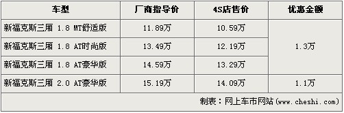 據(jù)4S店銷售人員介紹:目前福克斯三廂1.8升車型有1.3萬元的優(yōu)惠,經(jīng)優(yōu)惠后三款1.8L車型售價分別降為了10.59萬元、12.19萬元和13.29萬元。2.0L車型有1.1萬元的優(yōu)惠,優(yōu)惠后售價降到了14.09萬元。