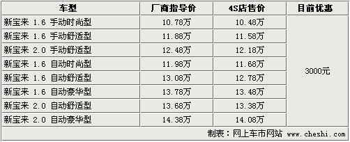 據(jù)4S店銷售人員介紹:目前大眾新寶來(lái)全系可優(yōu)惠3000元。目前新寶來(lái)全系現(xiàn)車較充足,顏色也比較齊全。如需預(yù)定車輛需等待2周至一個(gè)月時(shí)間,訂車周期較短,如著急用車的朋友請(qǐng)安排好用車時(shí)間。車價(jià)方面,新寶來(lái)在優(yōu)惠3000外,個(gè)別經(jīng)銷商還可送一些簡(jiǎn)單裝飾,主要是腳墊等。