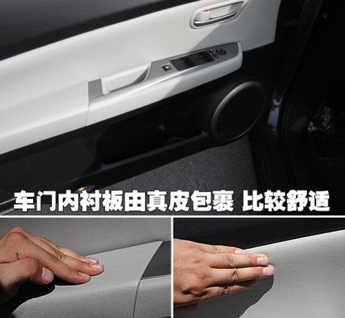 車門內(nèi)襯板由真皮包覆,材質(zhì)比較柔軟,駕車時(shí)或長途駕駛,喜歡把胳膊放在車門邊的朋友都會感到比較舒適。