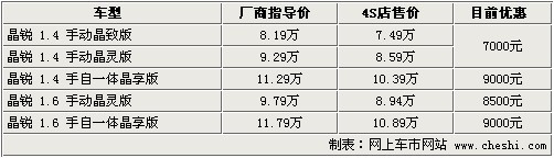 據(jù)4S店銷售人員介紹:目前晶銳全系最高優(yōu)惠達(dá)9000元,最低僅售7.49萬(wàn)。晶銳目前各店內(nèi)現(xiàn)車較少,只有個(gè)別車型有現(xiàn)車,如需預(yù)定需等待1個(gè)半月時(shí)間。價(jià)格方面,如到店內(nèi)洽談可獲得更高優(yōu)惠。1.4升手動(dòng)車型優(yōu)惠幅度,由原來(lái)的6000元增至7000元,而1.4升與1.6升自動(dòng)擋車型已優(yōu)惠9000元,相比之前的6000元增幅達(dá)33.3%。