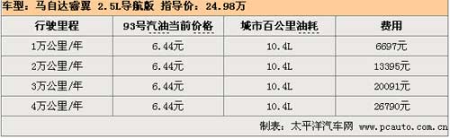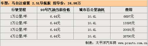 睿翼是我們對(duì)比的中高級(jí)車(chē)中油耗最低的一款車(chē),城市百公里油耗僅為10.4L,對(duì)于一款2.5L排量的車(chē)型來(lái)說(shuō)可謂十分出眾,而且馬自達(dá)廠商聲稱(chēng)睿翼是可以使用93號(hào)汽油的而且不會(huì)對(duì)發(fā)動(dòng)機(jī)造成影響,93號(hào)汽油比97號(hào)油每升便宜了0.41元!所以總體來(lái)說(shuō),假如車(chē)主每年行駛3萬(wàn)公里的話,一年下來(lái)對(duì)比燃油費(fèi)用最高的銳志可以節(jié)省近5000元。
