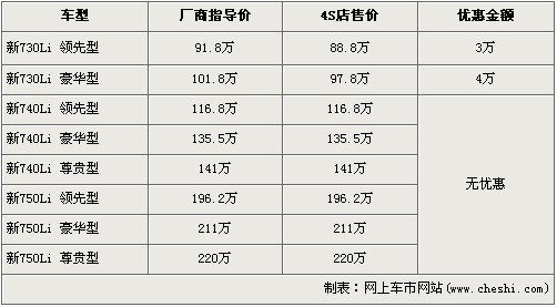 據北京寶馬經銷店銷售人員介紹,寶馬新7系共分為730Li、740Li、750Li三種等級車型,售價區(qū)間為91.8萬元-220萬元。目前購買新730Li領先型的消費者可以得到3萬元的優(yōu)惠,新730Li豪華版車型可以優(yōu)惠4萬元。消費者還介紹,除了新730Li有現(xiàn)車外,其余車型均需預訂,訂金是10萬元,最早12月份可提車。