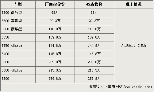 據(jù)北京奔馳4S店銷售人員介紹,奔馳新一代S級(jí)共有9個(gè)車型,售價(jià)區(qū)間為93萬元-25.8萬元。前端時(shí)間到店的奔馳新S級(jí)S350L已經(jīng)全部售出,目前店內(nèi)全系無現(xiàn)車。欲購買的消費(fèi)者需交訂金5萬元,最早下個(gè)月可提車。