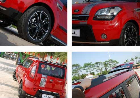 東風(fēng)悅達(dá)起亞SOUL由官方提供了一套改裝配件,正如您在上面照片中所看到的,包括前后保險(xiǎn)杠、大燈下方的燈眉、18寸黑色花型輪轂、車身側(cè)面裙邊包圍、后尾翼以及車身拉花,一臺普通的SOUL就這樣變身為了一臺與眾不同的SOUL,多了幾分動感也多了幾分張揚(yáng)。