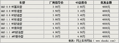 據(jù)奇瑞QQ3專營(yíng)店銷售人員介紹,奇瑞QQ3系列車型比較齊全,只有1.1AMT車型現(xiàn)車較少。但目前QQ3全系都有一定的優(yōu)惠幅度,除現(xiàn)車較少的車型需要提前預(yù)訂以外,全系車型均可以優(yōu)惠4000元。另外QQ6全系車型也可在指導(dǎo)價(jià)的基礎(chǔ)上優(yōu)惠4000元。