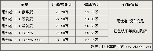 據(jù)東風(fēng)本田4S店銷售人員介紹,目前思鉑睿全系車型無優(yōu)惠,現(xiàn)車比較充足,現(xiàn)車顏色以白色、銀色、藍(lán)色為主。思鉑睿全系提供了塔夫綢白、彩晶黑、鈦金銀、炫影藍(lán)、炫動紫五種外觀顏色,以及靜雅黃、靜逸黑兩種內(nèi)飾顏色供消費者選擇。TYPE-S車型還推出炫速紅專用色,在年底前現(xiàn)車將會到店。北京地區(qū)各4S店由于訂單不同,各店銷售的現(xiàn)車顏色有所不同。