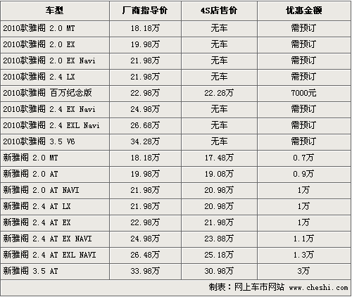 據(jù)4S店銷售人員介紹,目前部分2010款百萬紀(jì)念版雅閣新車已經(jīng)到店,消費(fèi)者購車的話可以優(yōu)惠7000元。其他款車型還需要預(yù)訂,訂金為2000元。現(xiàn)在店內(nèi)08款車型最高可優(yōu)惠現(xiàn)金3萬元,入門級車型優(yōu)惠現(xiàn)金7000元,以2.0手動(dòng)檔為例,優(yōu)惠后僅首17.49萬,F(xiàn)在店內(nèi)有黑色、銀色等可供消費(fèi)者選擇。