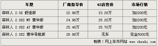 據(jù)斯巴魯4S店銷售人員介紹,目前森林人全系店內(nèi)的實際銷售價格比原來指導(dǎo)價增加了2248元,主要原因是全系增加了倒車?yán)走_(dá)以及尾喉配置。目前2.0XS自動導(dǎo)航版和2.5XS兩款車型均有現(xiàn)車供應(yīng),顏色主要為藍(lán)色、白色、紅色、黑色。部分顏色及車型還需要預(yù)訂,訂金為5000元,最快一個月可以提到車。另據(jù)介紹,2.0XS豪華導(dǎo)航版已停止生產(chǎn)。北京地區(qū)各4S店由于訂單不同,各店銷售的現(xiàn)車顏色有所不同。
