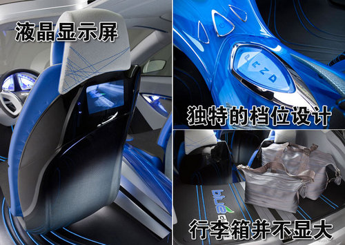 內(nèi)飾方面大量采用了藍(lán)色光,車內(nèi)檔位部分采用了類似盾形的設(shè)計,風(fēng)格大膽,超乎人的想象。在駕駛座后排還安裝有液晶顯示屏幕,同時時尚的行李箱也透出新穎的概念設(shè)計。
