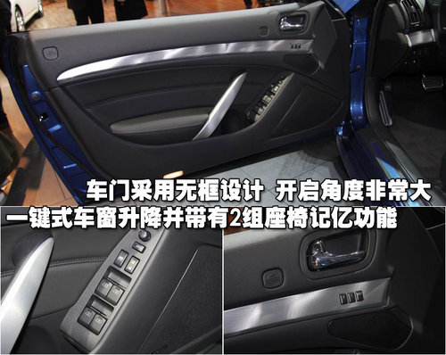 G37敞篷版采用了跑車流行的無框式設(shè)計(jì),車門的開啟角度非常大,極大方便了上下車。同時(shí)駕駛門集合了一鍵式車窗升降以及電動(dòng)后視鏡調(diào)節(jié)。并帶有兩組座椅記憶功能。