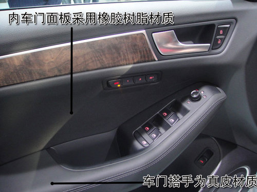 奧迪Q5車門內側拉手采用金屬磨砂處理,提升了視覺效果,并且與車門內飾板接縫均勻。內門拉手開啟力度適中,回位迅速。