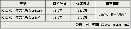 MINI在誕辰50周年之際將推出兩款紀(jì)版車型,分別為MINI 50 Mayfair和MINI 50 Camden車型。在本屆廣州車展上,MINI首次攜帶此兩款紀(jì)念版車型在大眾面前亮相。據(jù)了解,北京各家MINI經(jīng)銷店已經(jīng)可以接受此輛款車的預(yù)訂,具體價格詳情請看下表: