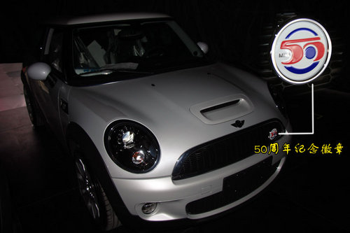 MINI 50 Camden紀(jì)念版車型采用特有的熱巧克力、子夜黑和胡椒白三種顏色,與之相匹配的車頂分別為白色、同色或者黑色。在本屆車展上,MINI給觀眾帶來的是白色車身的MINI 50 Camden。MINI 50 Camden外觀上與Cooper S大體上并無區(qū)別,只是在個別細(xì)節(jié)上加上了自己專署的標(biāo)識。車頭前進(jìn)氣格柵上加裝了50周年徽章,黑色的前大燈以及前引擎蓋上的進(jìn)氣口增加了整車的運(yùn)動味兒。