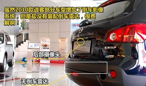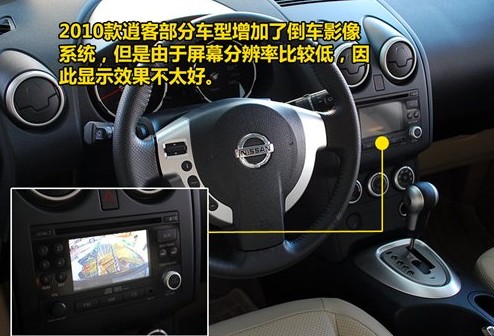 新的逍客在外觀上沒有任何變化,僅僅只在原來6款車身顏色的基礎(chǔ)上增加夢幻銀色。更多的變化出現(xiàn)在車輛內(nèi)部的配置上,部分車型增配了倒車影像系統(tǒng),但我們卻認為這個并不實用,因為屏幕只有4.3英寸,也就是和一般車載導(dǎo)航儀的大小相當(dāng),而且分辨率比較低,所以顯示效果不好。令人費解的還有,有了攝像頭之后,逍客卻沒有裝配倒車雷達,其實大家在倒車的時候,倒車影像只是作為參考,主要還是依靠倒車雷達的聲音來判斷距離遠近,所以沒有倒車雷達很不方便。