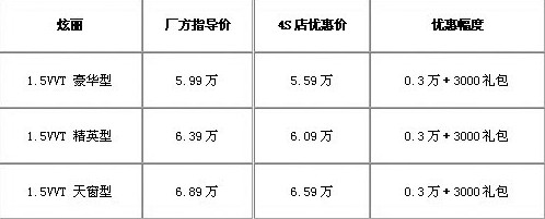 車天下編輯近日從長城汽車獲悉,憑借歐盟認證的金字招牌,長城炫麗銷量再創(chuàng)新高,11月銷量高達7000臺。為了在歲末銷售旺季到來時擴大戰(zhàn)果,在炫麗上市一周年之際,對炫麗全系車型實行最高6000元的大幅優(yōu)惠。具體優(yōu)惠幅度如下:1.5L車型優(yōu)惠幅度擴大到6000元,其中包含3000元現金和價值3000元的超值大禮包。