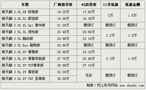 筆者了解,相比11月份的優(yōu)惠幅度,目前新天籟價(jià)格最高優(yōu)惠僅為1.8萬(wàn)元,上個(gè)月的最高優(yōu)惠則為2.3萬(wàn)元,但是現(xiàn)車供應(yīng)情況仍然比較緊張,除了標(biāo)準(zhǔn)版和舒適版有部分可選擇外,2.5升的部分車型仍需要訂購(gòu),月底將到一批新車。入門級(jí)優(yōu)惠后售價(jià)為17.68萬(wàn)。