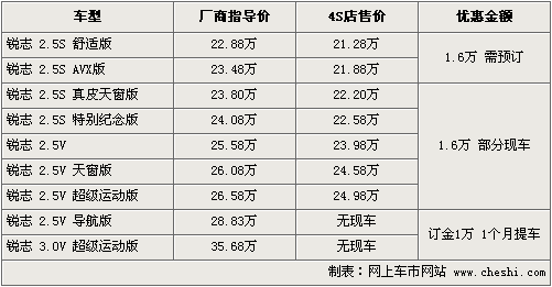 據(jù)一汽豐田4S店銷售人員介紹,目前銳志可優(yōu)惠1.6萬元,現(xiàn)車比較齊全,一般購買車型主要集中在舒適版和紀(jì)念版,消費(fèi)者可根據(jù)需要選購。另據(jù)介紹,新銳志車型要在明年4月北京車展亮相,之后2個(gè)月左右才可以購買到,并且新款車型剛上市不會有現(xiàn)款這么大的優(yōu)惠空間,目前購買現(xiàn)款銳志也是一個(gè)不錯(cuò)的選擇。如消費(fèi)者有意購買,到店詳談會有更優(yōu)惠的價(jià)格。北京地區(qū)各4S店由于訂單不同,各店銷售的現(xiàn)車顏色有所不同。