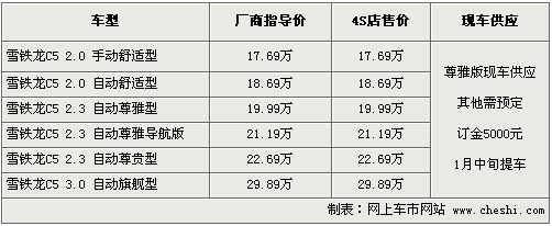 據(jù)東風雪鐵龍4S店經(jīng)銷人員介紹,目前東風雪鐵龍C5現(xiàn)車供應也比較緊張,只有自動尊雅版有少量黑色現(xiàn)車供應,其他款均需要預訂,訂金為5000元,預計1月中旬可以提車。