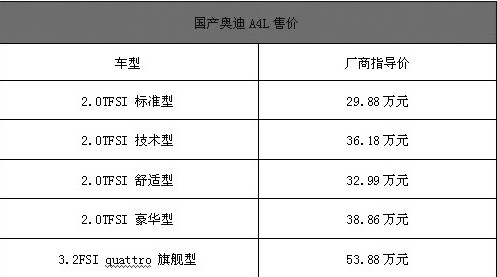 2009年1月5日,一汽-大眾在海南省三亞市正式宣布其開始在國(guó)內(nèi)銷售奧迪A4L,這是第8代奧迪A4的國(guó)內(nèi)版本。新的奧迪A4L在今天共有裝備2款發(fā)動(dòng)機(jī)的5款車型銷售,官方指導(dǎo)價(jià)格從29.88到53.88萬元,相信在一段時(shí)期內(nèi),國(guó)內(nèi)消費(fèi)者在全國(guó)各大奧迪4S店購(gòu)買A4L的時(shí)候都會(huì)執(zhí)行這個(gè)售價(jià)。