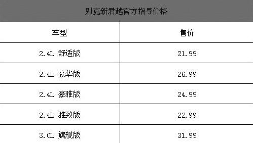 7月8日,別克君越換代車(chē)型新君越公布價(jià)格上市,價(jià)格從21.99-31.99萬(wàn)元區(qū)間,比我們之前預(yù)測(cè)的價(jià)格稍高一些,其中新君越頂配車(chē)型的售價(jià)超過(guò)30萬(wàn)元區(qū)間,以下是新君越各款車(chē)型官方指導(dǎo)價(jià)格:別克新君越官方指導(dǎo)價(jià)格