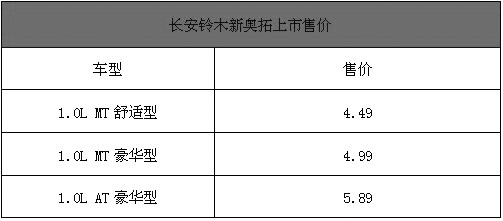 9月16日,長(zhǎng)安鈴木新奧拓正式上市。此次上市的新奧拓將推出1.0L排量三款車型,分別為1.0L手動(dòng)舒適型、1.0L手動(dòng)豪華型和1.0L自動(dòng)豪華型,售價(jià)在4.49-5.89萬(wàn)元之間。具體售價(jià)如下表:長(zhǎng)安鈴木新奧拓上市售價(jià)