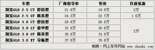 據4S店銷售人員介紹:目前別克GL8全系大部分車型可優(yōu)惠2萬元,僅有2.5升精英型優(yōu)惠1.6萬元。目前2.5排量車型2款均有現車,但顏色并不齊全,主要有銀色及藍色。3.0升車型無現車,預定需等2-3周時間,優(yōu)惠也可到2萬元。目前GL8系列車型經過優(yōu)惠后,最低售價不足20萬元。