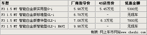 據比亞迪汽車4S店銷售人員介紹,目前比亞迪F3智能白金版只有實用型和豪華型有現車銷售,智能型和標準型都現車不足,F在購買比亞迪F3智能白金版可以有較大的優(yōu)惠幅度,其中實用型可以優(yōu)惠5300元;豪華型也可優(yōu)惠7800元。該比亞迪4S店銷售人員表示,如果到店詳談,還可以有更多的優(yōu)惠幅度。