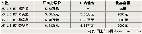 據(jù)奇瑞汽車4S店銷售人員介紹,目前奇瑞A5標(biāo)準(zhǔn)型由于配置太低,4S店內(nèi)無車銷售,其他三款車型現(xiàn)車都比較齊全,F(xiàn)在A5的優(yōu)惠幅度比元旦前要少,只能優(yōu)惠2000元,而且不能贈(zèng)送裝飾。