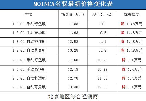 近日,編輯從北京地區(qū)綜合經(jīng)銷商處了解到,現(xiàn)代MOINCA名馭的現(xiàn)車比較充足,即使是冷門顏色車型,預定等待的時間也不會很久。據(jù)經(jīng)銷商透露,MOINCA名馭最高可以優(yōu)惠不到1.5萬元,并且會贈送一些基本的汽車裝潢;但是消費者要想以這個價格提車,需要在店內(nèi)做一條龍,其中車輛四項基本保險可以打9.5折(約合4100-4600元左右)。以下是MOINCA名馭最新價格變化表: