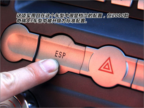 在內飾方面,2010款奇瑞A3也是完全沿用了前款車型的設計,只是在一些安全性配置方面有所加強。首先,她們引以為傲的ESP功能更加親民的改成了全系標配。其次在一些高配車型上,由雙氣囊改成了六氣囊,除原有的正副駕駛位的氣囊外,又在兩側的A、B柱上加裝了安全氣簾,是車輛的安全性得到很到的加強。