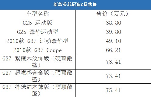 1月11日,英菲尼迪G系全線上市。其中,英菲尼迪 G37硬頂敞篷跑車為人民幣75.41萬元(特殊紅木飾版)和73.41萬元(木飾版);G25 運(yùn)動(dòng)型豪華轎車售價(jià)為人民幣39.8萬元(豪華運(yùn)動(dòng)版)和38.8萬元(運(yùn)動(dòng)版)。同期上市的還有2010款英菲尼迪 G37雙門跑車和四門運(yùn)動(dòng)型豪華轎車,售價(jià)分別為人民幣66.21萬元和49.1萬元。