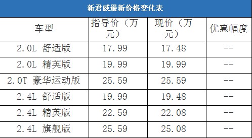 今日,編輯從北京地區(qū)通用別克4S經(jīng)銷商處了解到,新君威的現(xiàn)車十分緊張,只有少量2.0T車型,消費(fèi)者現(xiàn)在預(yù)訂該車的話勉強(qiáng)能夠保證在春節(jié)前提車。據(jù)經(jīng)銷商透露,因?yàn)樾戮恢睙徜N,車源比較緊張,所以消費(fèi)者購(gòu)車沒(méi)有任何優(yōu)惠。以下是新君威最新價(jià)格變化表: