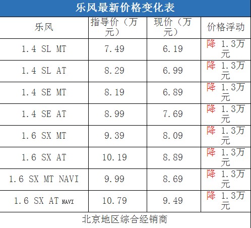 樂風(fēng)SL車型與SE車型的差價(jià)為7000元,在配置上SE車型增加了車內(nèi)中控鎖、遙控鑰匙、后視鏡電動(dòng)調(diào)節(jié)和音響揚(yáng)聲器;作為一款主打性價(jià)比的小車而言,基本款的樂風(fēng)就可以滿足一般家用消費(fèi)者的需要。而樂風(fēng)1.6L排量車型的定價(jià)在小型車中不論是從性能還是從配置上來說競爭力都不明顯。
