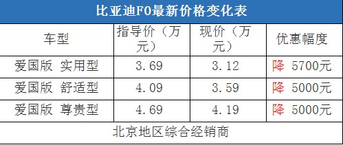近日,編輯從北京地區(qū)比亞迪綜合經(jīng)銷商處了解到,近期比亞迪F0的現(xiàn)車比較充足,有紅色和銀色現(xiàn)車,基本上可以滿足消費者在春節(jié)前的購車需求。目前購車最高可以優(yōu)惠5700元現(xiàn)金,但是購車需要在店內(nèi)做一條龍服務才可以,其中車輛四項基本保險可以打8.5折(約合2200-2500元左右),銷售人員透露這個折扣到店還可以再議。以下是比亞迪F0最新價格變化表: