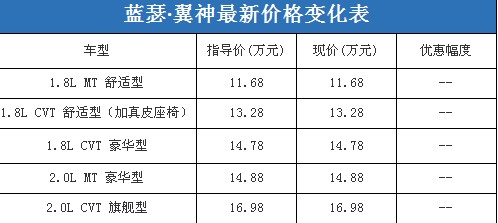 近日,編輯從北京地區(qū)東南三菱4S經銷商處了解到,藍瑟·翼神在店內有少量現車(紅色、黑色),其中1.8L CVT舒適型在店中加裝了真皮座椅,價格是原指導價增加3000元。相比之下,編輯了解到藍瑟·翼神在綜合經銷商處雖然沒有現車,但是現在訂車可以優(yōu)惠2000元現金,要等到春節(jié)之后才能夠提車。以下是藍瑟·翼神最新價格變化表: