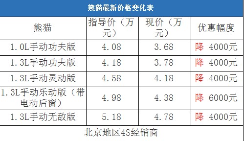 近日,編輯從北京地區(qū)吉利4S經(jīng)銷(xiāo)商處了解到,熊貓有少量現(xiàn)車(chē)在店內(nèi)銷(xiāo)售,全系可以?xún)?yōu)惠4000元現(xiàn)金,并贈(zèng)送腳墊、貼膜等基本裝飾。其中店內(nèi)有一臺(tái)1.3L手動(dòng)樂(lè)動(dòng)版特價(jià)車(chē)(紅色),因?yàn)槭?9年生產(chǎn)的,可以?xún)?yōu)惠6000元現(xiàn)金,性?xún)r(jià)比還不錯(cuò),消費(fèi)者可以到店詳談爭(zhēng)取更多優(yōu)惠。以下是熊貓最新價(jià)格變化表: