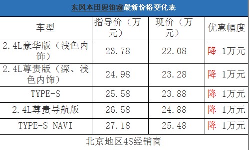 近日,編輯從北京地區(qū)東風(fēng)本田4S經(jīng)銷商處了解到,目前思鉑睿在店內(nèi)有少量現(xiàn)車,購(gòu)車全系可以優(yōu)惠1萬(wàn)元現(xiàn)金。以下是思鉑睿最新價(jià)格變化表: