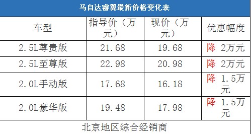 近日,編輯從北京地區(qū)一汽馬自達(dá)4S經(jīng)銷商處了解到,睿翼的2.0L車型和2.5L車型都有現(xiàn)車在售,2.5L車型在4S店的優(yōu)惠為8000元,而上市不久的2.0L車型只有禮包贈(zèng)送。相比之下,綜合經(jīng)銷商處的馬自達(dá)睿翼優(yōu)惠幅度非常大,2.5L車型已經(jīng)跌破了20萬(wàn)元,2.0L車型也有了1.5萬(wàn)元的現(xiàn)金優(yōu)惠。以下是馬自達(dá)睿翼最新價(jià)格變化表: