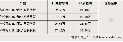 據(jù)雪弗蘭科經(jīng)銷商銷售人員介紹,消費(fèi)者于近期購(gòu)買雪佛蘭-科帕奇任意一款車型,可以得到1萬(wàn)元的現(xiàn)金優(yōu)惠,2.4L排量高配的七座手自一體豪華版經(jīng)優(yōu)惠后售價(jià)為25.58萬(wàn)元,而低一級(jí)的2.4L手動(dòng)五座舒適版經(jīng)優(yōu)惠后售價(jià)降為21.48萬(wàn)元。頂級(jí)的3.2L自動(dòng)7座旗艦版經(jīng)優(yōu)惠后,售價(jià)從37.28萬(wàn)元下降到了36.28萬(wàn)元。