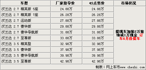 據(jù)廣汽豐田4S店銷售人員介紹,國產(chǎn)漢蘭達自上市以來持續(xù)熱銷,目前漢蘭達現(xiàn)貨非常緊張,如果消費者急于提現(xiàn)車的話,需要在店內加裝2萬元的汽車裝飾或加價1萬元現(xiàn)金。如預訂則需要到今年6月份才能提到車,訂金為1萬元。北京地區(qū)各4S店由于訂單不同,各店銷售的現(xiàn)車顏色有所不同。
