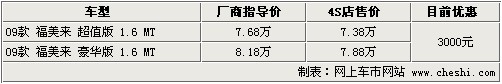 據(jù)4S店銷售人員介紹:09款福美來目前最高優(yōu)惠3000元,在北京地區(qū)銷售車型僅有兩款,分別為手動(dòng)超值版及手動(dòng)豪華版,售價(jià)分別為7.68萬及8.18萬,優(yōu)惠后價(jià)格僅為7.38萬。車款顏色方面,共有白色、銀色、黑色等暢銷顏色車型,如需預(yù)定需等半個(gè)月左右。