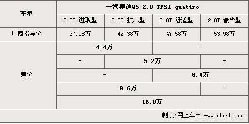 國產(chǎn)版奧迪Q5分為2.0T進(jìn)取型、2.0T技術(shù)型、2.0T舒適型以及2.0T豪華型4款車型,售價區(qū)間為37.98-53.98萬元。如上圖所示,4款車型中的最低差價為4.4萬元,而最高差價則高達(dá)16萬元。