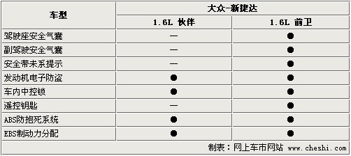 全新捷達雖然冠上全新二字,但消費者仍然不會對捷達的配置有非常大的興趣。對于這樣一款進行過幾次改型的老車型,配置方面不會有太大變化。在1.6L前衛(wèi)車型上,標配了前駕駛員與副駕駛安全氣囊,,保證了前排乘員的安全。駕駛員一側的安全帶帶有未系提示,時刻提醒駕駛員保證自身安全。全系標配的配置還有電子防盜系統(tǒng)、車內(nèi)中控鎖及ABS+EBD系統(tǒng)。1.6L伙伴并沒有裝備安全氣囊,配置較低。